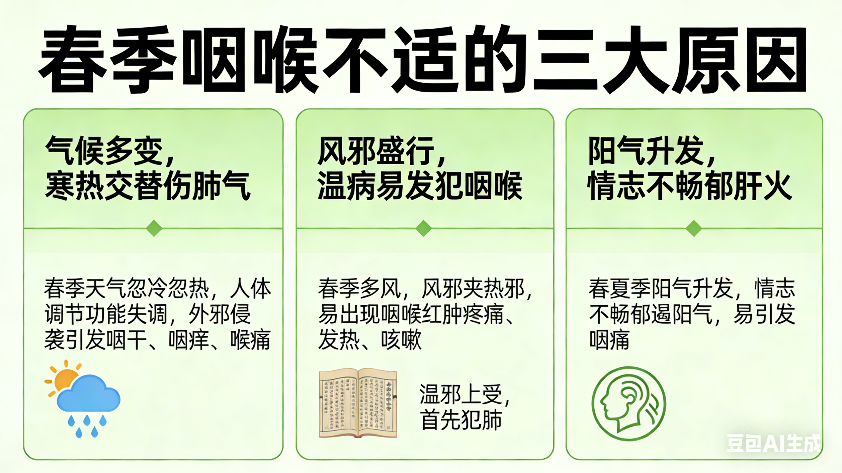中医理论认为,春季多风季节,风邪夹杂热邪,人们易出现咽喉红肿疼痛、发热、咳嗽等症状。清代名医叶天士曾说“温邪上受,首先犯肺”,呼吸道跟肺脏是连在一起的,所以感受温热邪气后,会出现嗓子痛、鼻子堵、鼻干、咽干等不适。