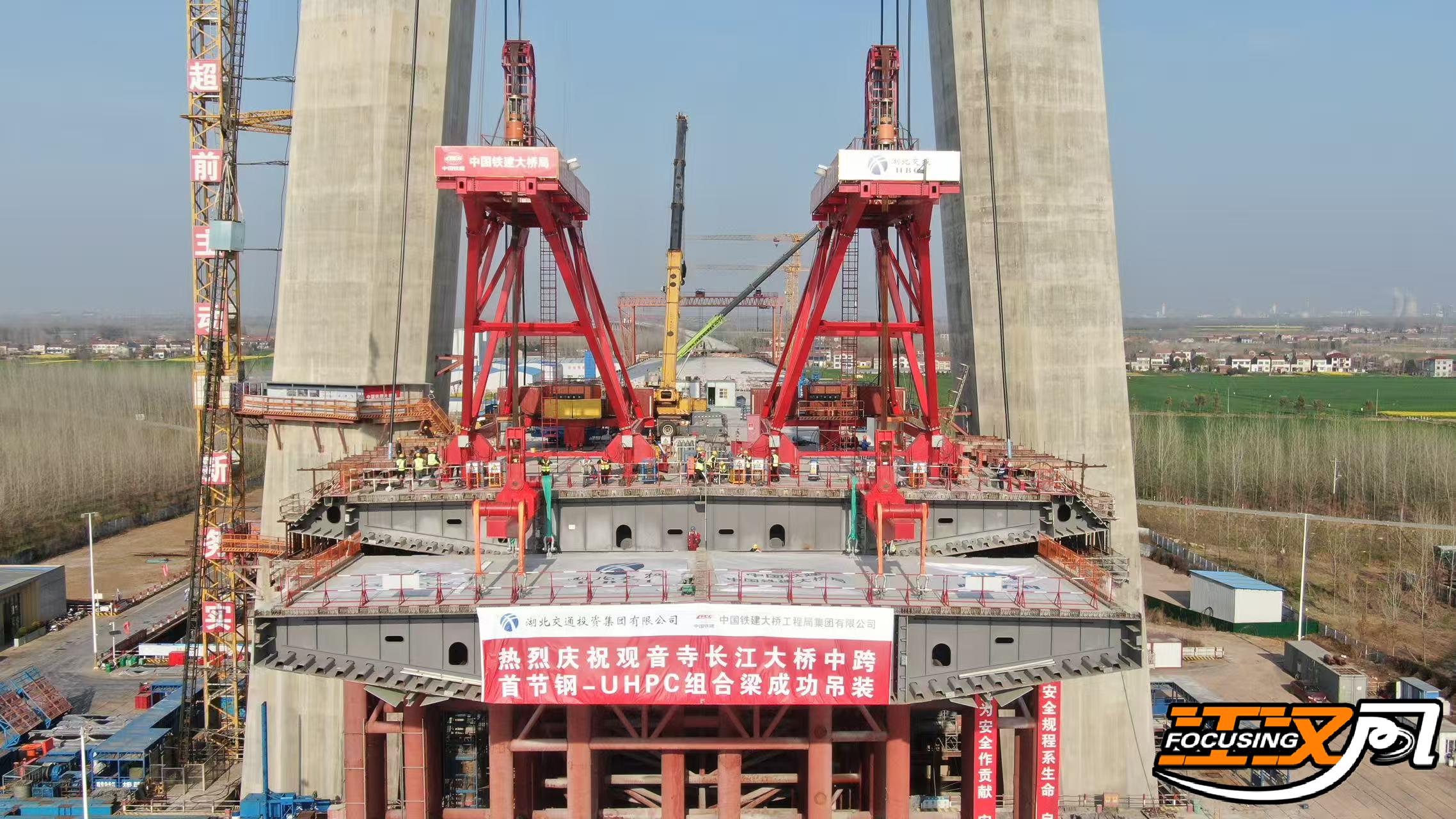 湖北荆州:观音寺长江大桥中跨首节钢箱梁成功吊装