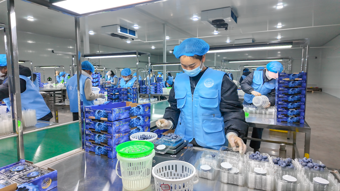 在首衡城K1农产品加工区,工人们正忙着对蓝莓进行分拣、打包