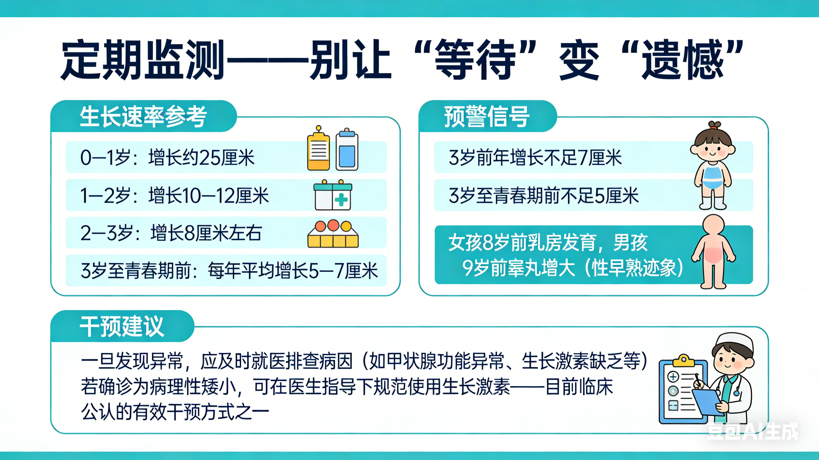 密切关注孩子生长速率和预警信号,一旦发现异常,应及时就医排查病因(如甲状腺功能异常、生长激素缺乏等)。若确诊为病理性矮小,可在医生指导下规范使用生长激素——这是目前临床公认的有效干预方式之一。