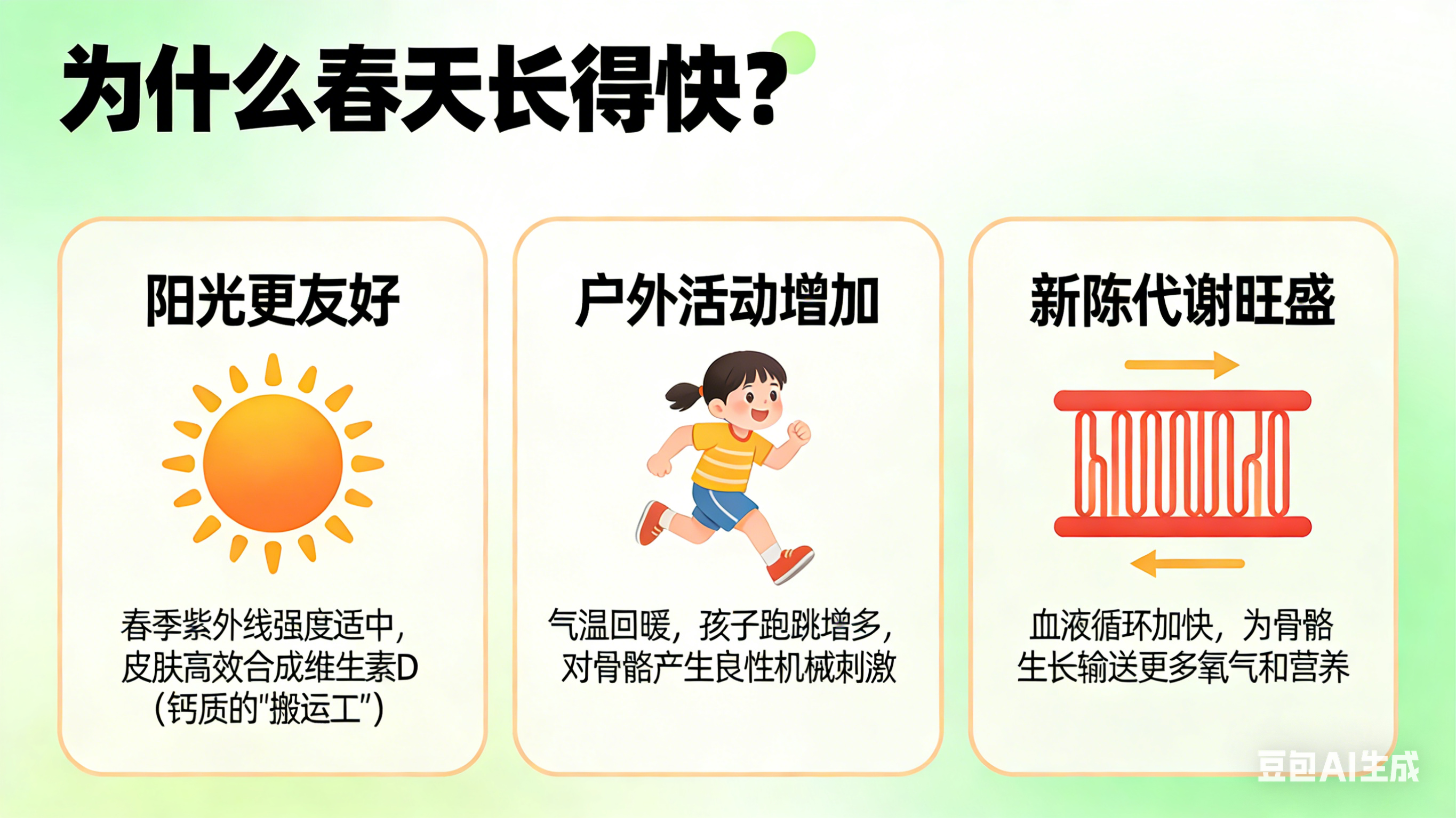 户外活动增加:气温回暖,孩子跑跳增多,对骨骼产生良性机械刺激;