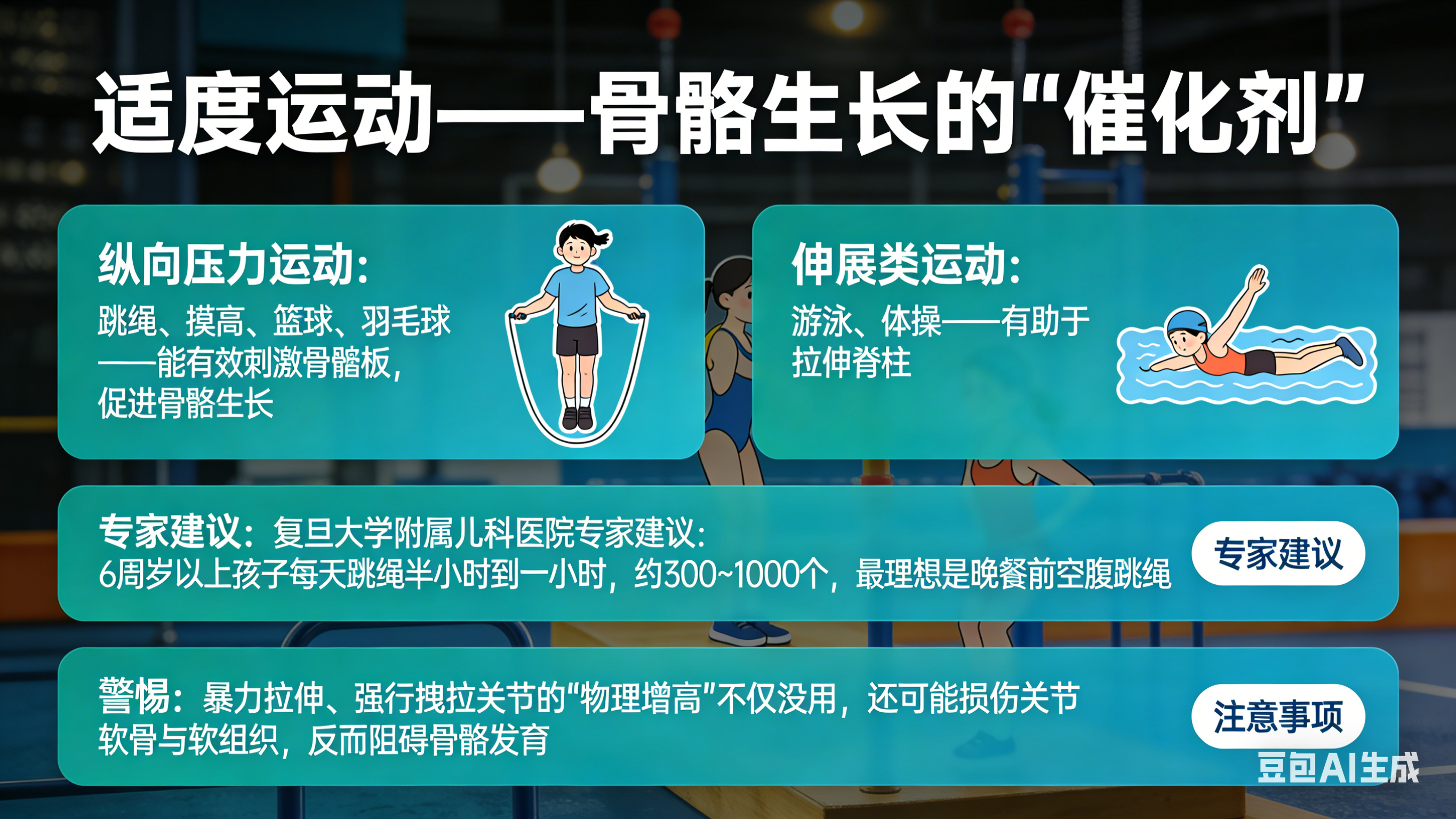 纵向压力运动:跳绳、摸高、篮球、羽毛球——能有效刺激骨骺板,促进骨骼生长;