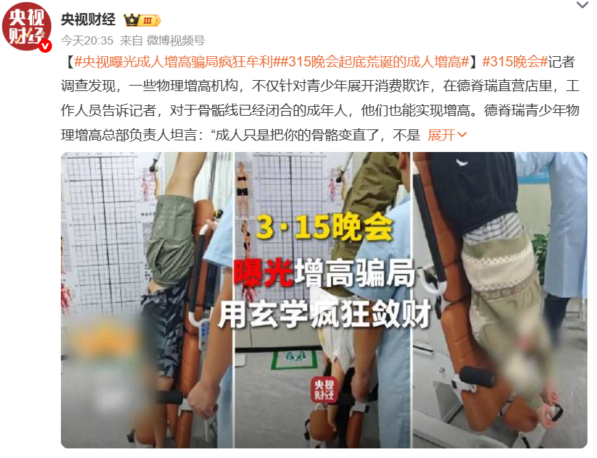 2026年央视“3·15”晚会,撕开了增高行业的神秘面纱。“安立身”“德脊瑞”“英瑞可”等连锁增高机构,打着“物理增高”“量子修复”的旗号,向焦虑的家长收取近2万元的年费,实则用儿童禁用的设备忽悠人,靠孩子自然生长的规律收割智商税。