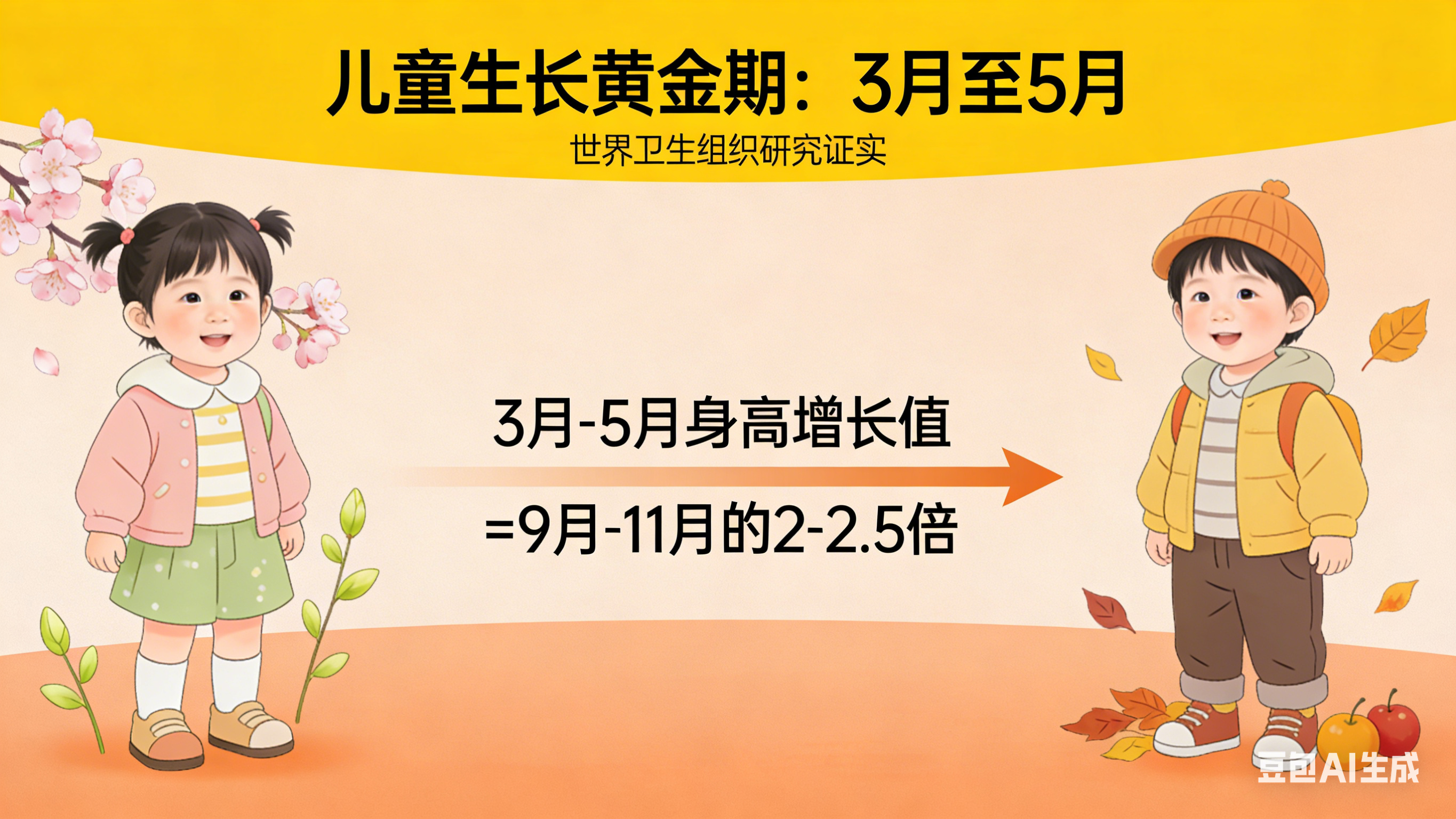 根据世界卫生组织的一项研究表明,儿童长得最快的时候是每年的3月至5月,在这3个月中,孩子身高增长值相当于9月至11月身高增长值的2倍至2.5倍。