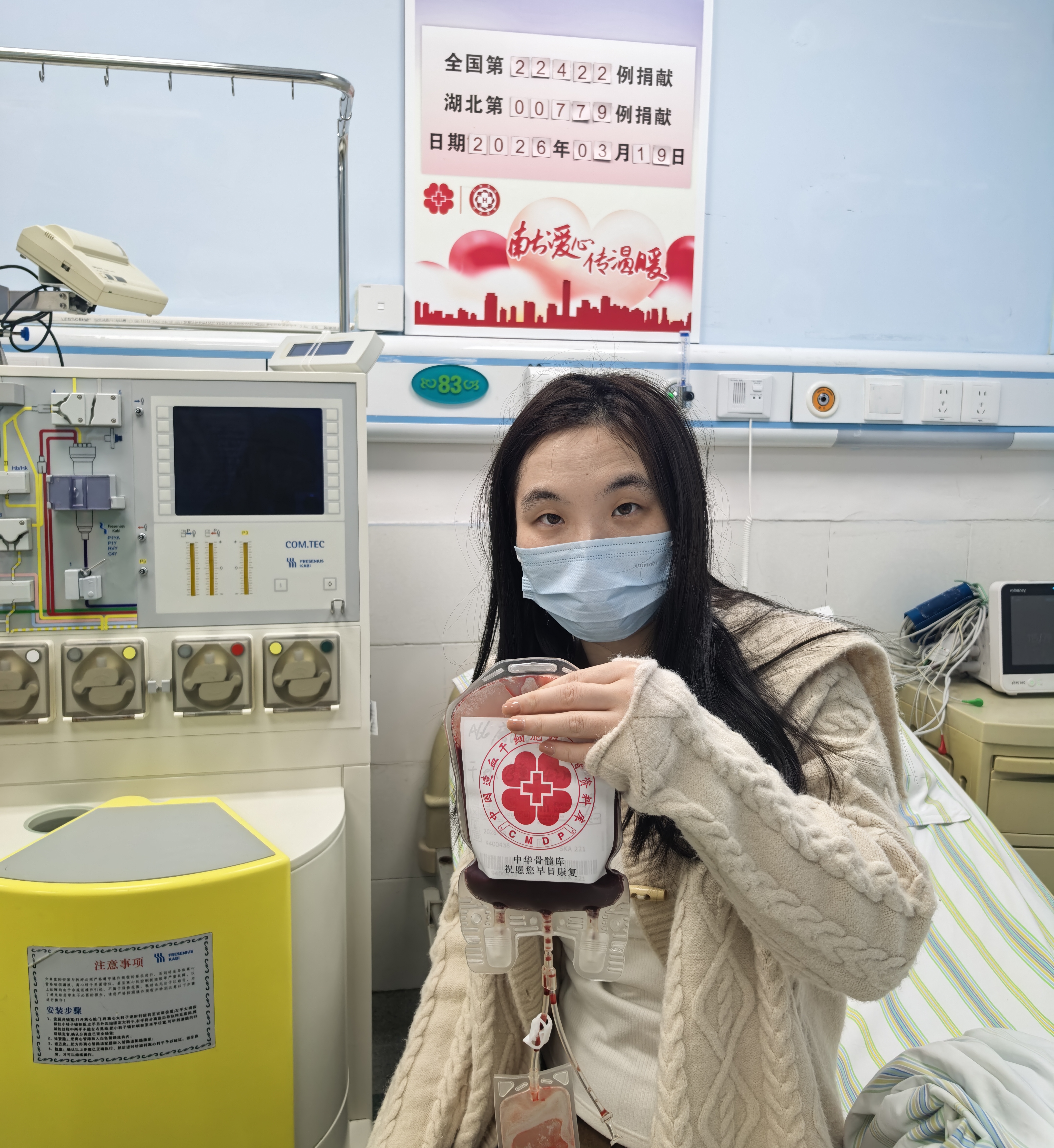 3月19日下午2点,伴随着血细胞分离机一声清脆的提示音,采集顺利结束。万华捐献了342毫升造血干细胞混悬液。这份承载着希望的“生命种子”,将第一时间移植入患者体内,帮助患者重启人生。