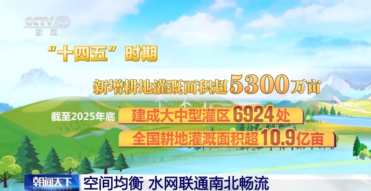 “十四五”时期新增耕地灌溉面积超5300万亩,截至2025年底,建成大中型灌区6924处,全国耕地灌溉面积超10.9亿亩,耕地灌溉面积上的粮食产量占全国粮食产量的80.76%,为保障国家粮食安全筑牢了水利基础。