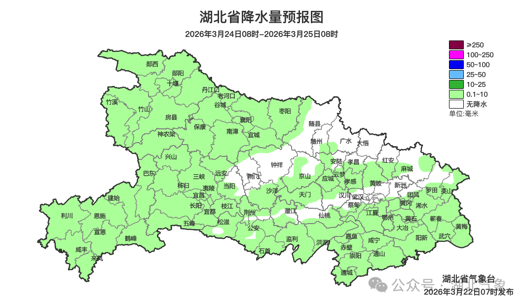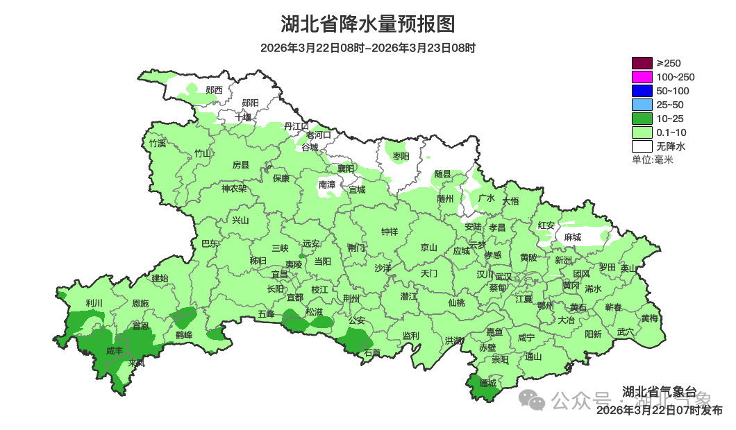 3月22日08时-23日08时,白天鄂东南小雨转多云;其他地区多云。晚上全省阴天转小雨,其中鄂西南、江汉平原南部、鄂东南南部局地中雨。最高气温鄂西南17~21℃、其他地区21~24℃,最低气温9~13℃,偏北风2到3级。