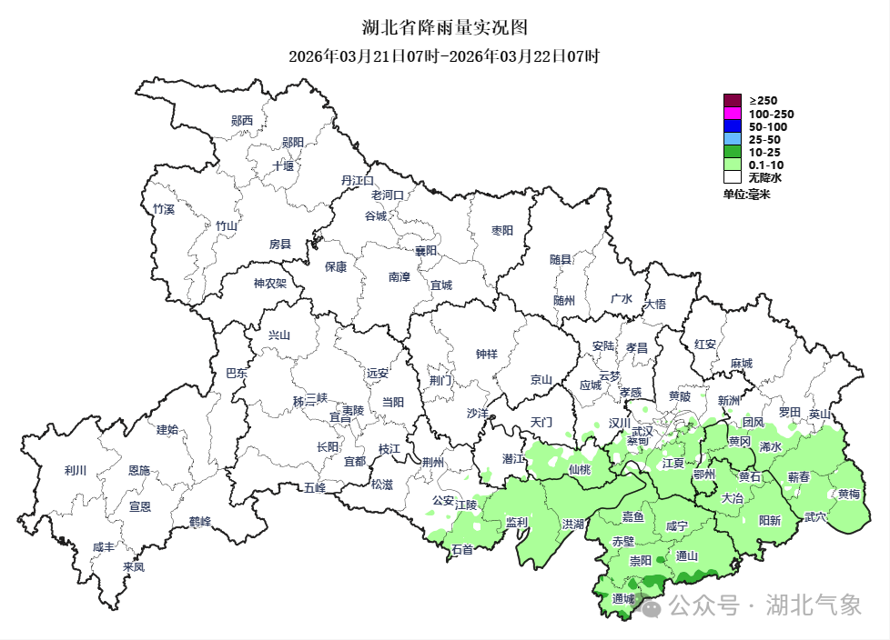 3月23日08时-24日08时,鄂东南、鄂东北东部、江汉平原南部阴天有小到中雨,其中鄂东南局地大雨;其他地区阴天有小雨,局地中雨。最高气温12~16℃,最低气温9~12℃,偏北风3到4级、阵风5到6级。