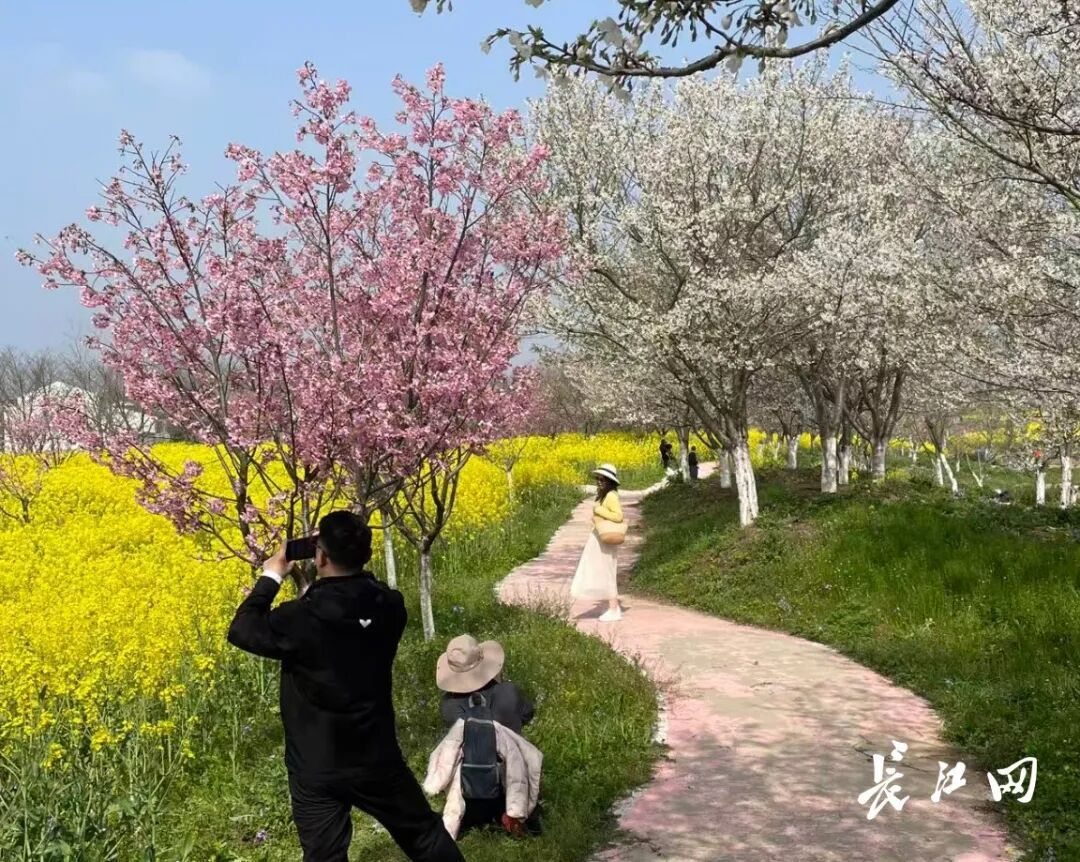 从武汉市民之家出发,驱车不到一个半小时,记者来到了位于李店镇的盛世闻樱景区,此时的景区正处于樱花最佳观赏期,千亩樱花连片绽放,如云似霞铺满山野,而桃花、杏花和成片的油菜花也不甘落后,竞相开放,璀璨花海成为武汉都市圈春日里最动人的风景之一。