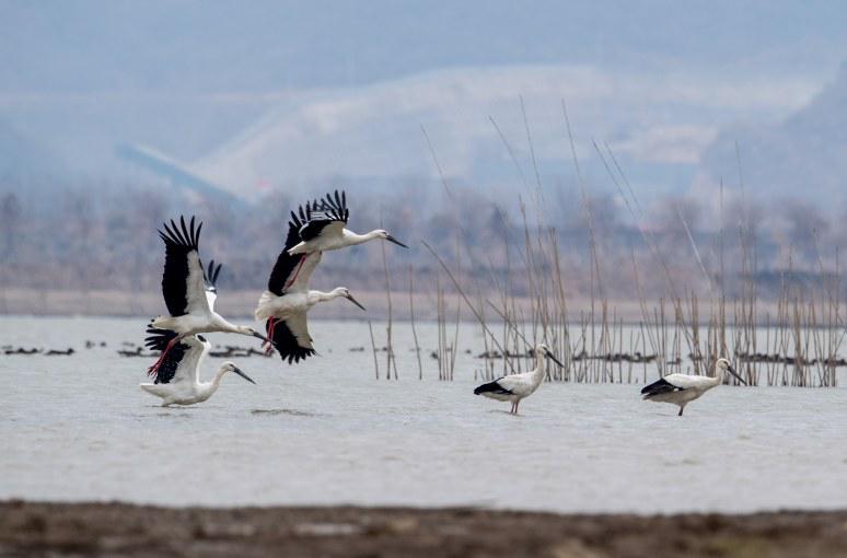 3月19日早晨7点,黄石市阳新县网湖上空渐渐热闹起来。一群东方白鹳盘旋而起,时而聚拢,时而散开,翅膀扇动的声音响成一片。