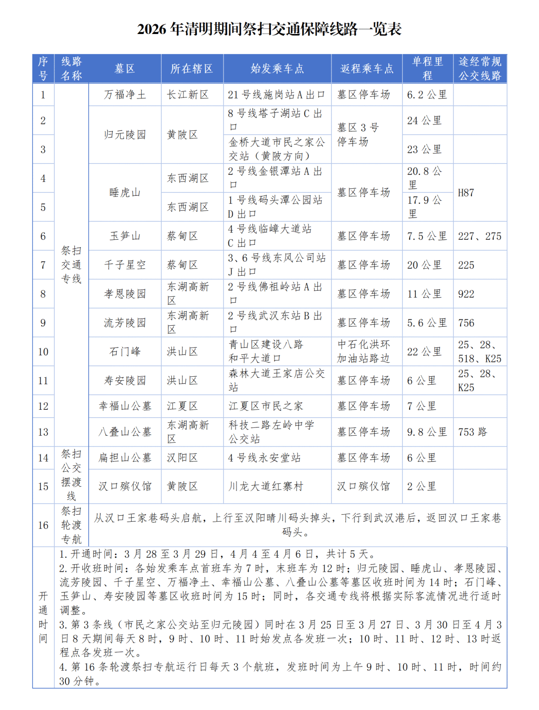 各专线始发乘车点首班车7时发车、末班车12时发车。归元陵园、睡虎山、孝恩陵园、流芳陵园、千子星空、万福净土、幸福山公墓、八叠山公墓等墓区收班时间为14时,石门峰、玉笋山、寿安陵园等墓区收班时间为15时。同时,市民之家公交站至归元陵园专线已提前启动试运行,3月25日-27日,3月30日至4月3日8天期间每天8时、9时、10时、11时始发点各发班一次;10时、11时、12时、13时返程点各发班一次。上述各交通专线运营时间和班次将根据实际客流情况进行适时合理调整。