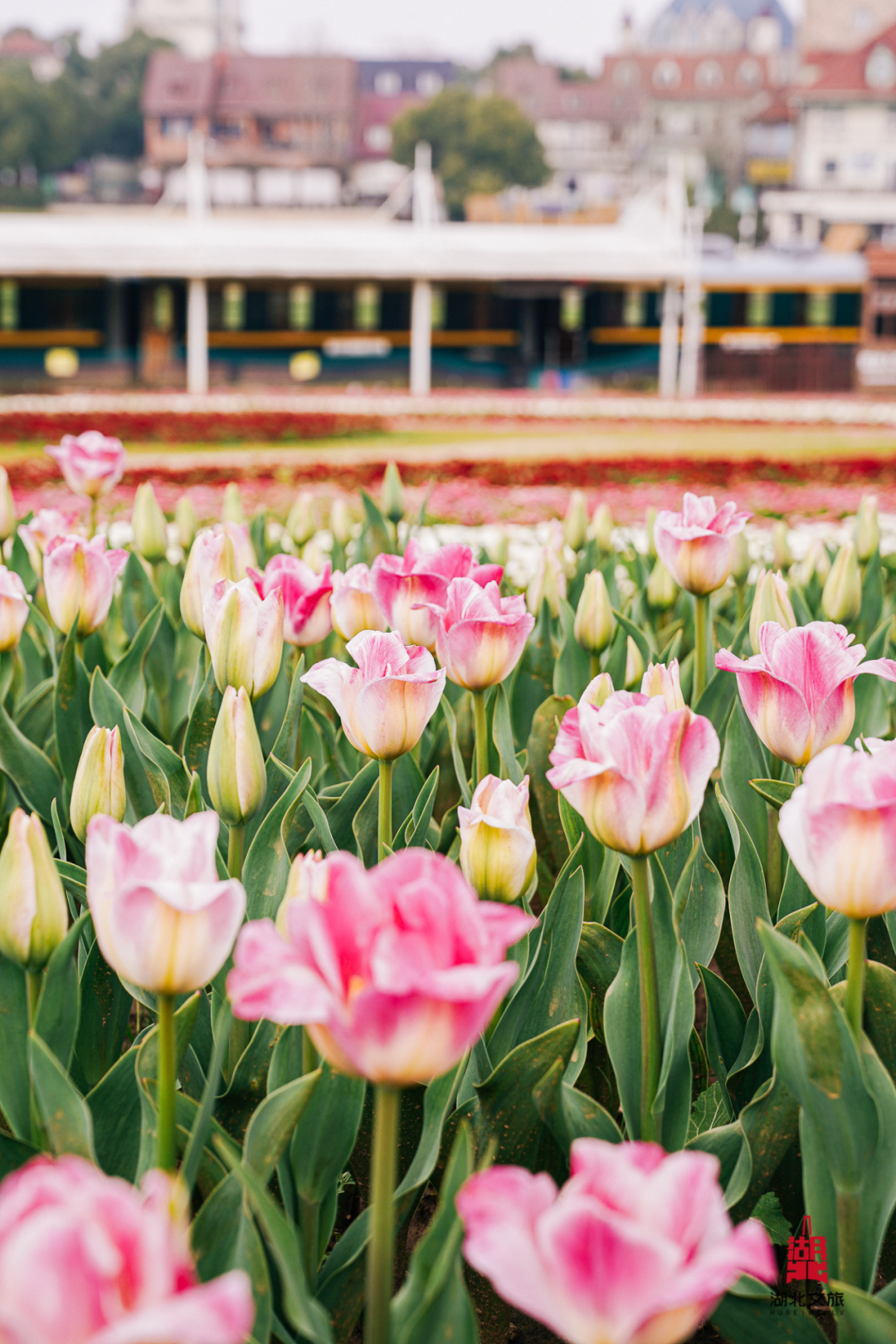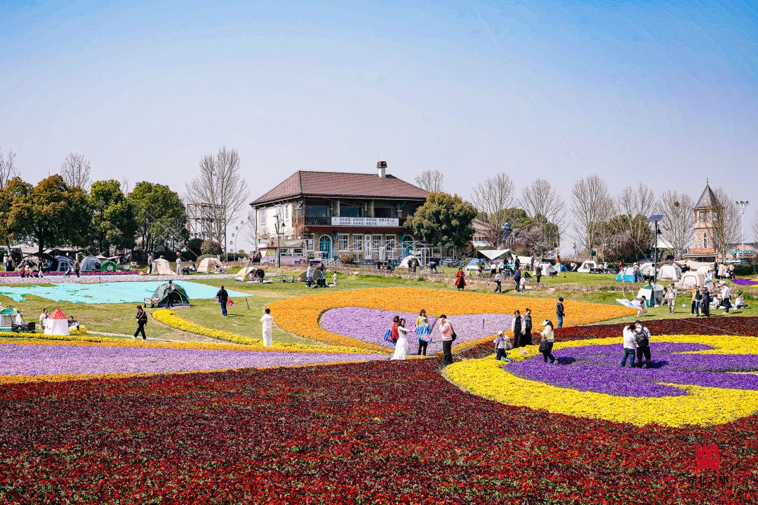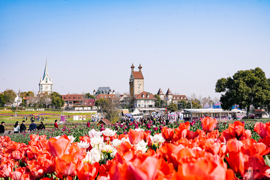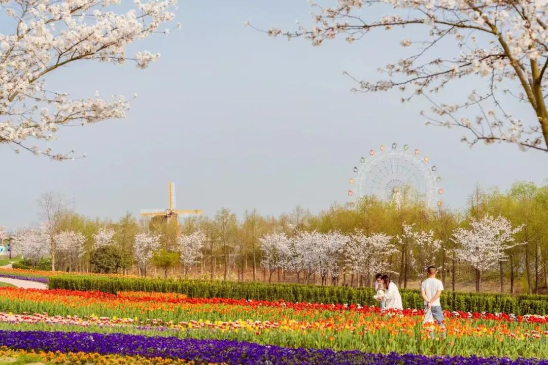 花卉阵容:2–3月主打数十万株郁金香(多品种色彩交织),搭配角堇、喜林草;3月中下旬樱花村樱树盛放,虞美人、马鞭草后续接力,花期覆盖2–5月;法式弗洛伊鲜花小镇作背景,拍照自带油画感。