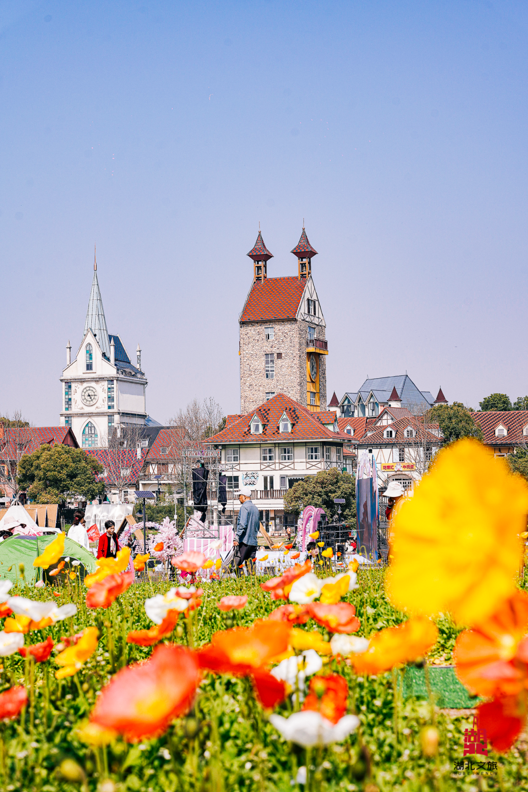 早樱盛放,虞美人、马鞭草也陆续接力盛开。花海深处,几座欧式城堡静静矗立,尖顶在蓝天下勾勒出优美的轮廓。城堡与花海,复古与浪漫在这里完美交融。