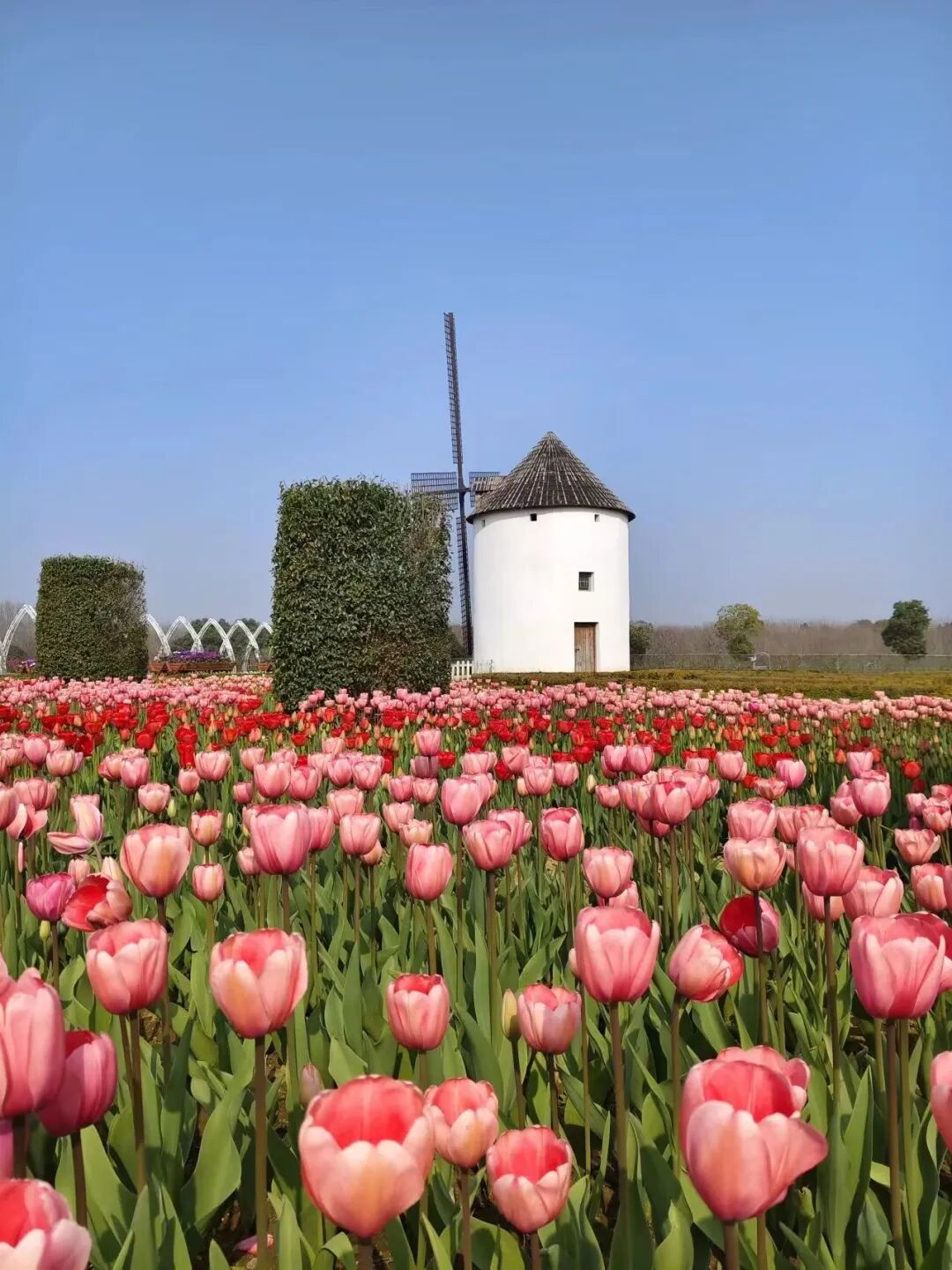 花海深处,高大的荷兰风车静静伫立,满满的异域风情。