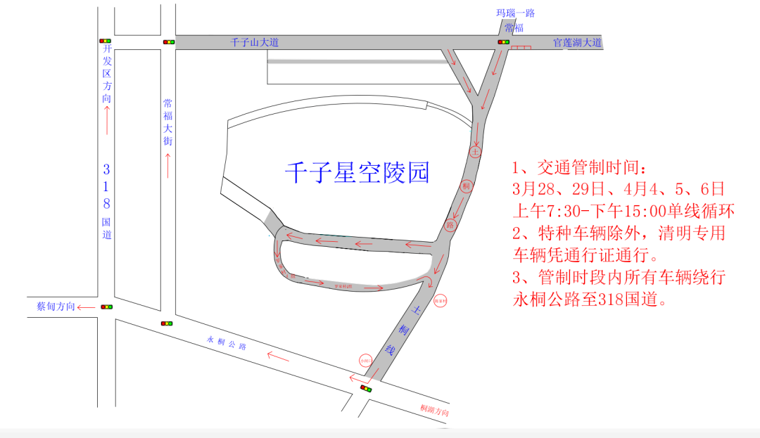 3月28日、3月29日、4月4日、4月5日、4月6日,每日7:00-15:00,园区周边道路将实行临时交通管理措施;交管部门在其他时间也会根据扫墓人流、车流情况灵活采取临时管控措施,请各位市民服从现场交警及工作人员指挥。