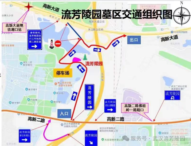 为保障祭扫期间道路安全与秩序,3月14日至4月12日园区内部实施临时交通管制:所有来园车辆统一由珞喻东路南门入园,石门峰北路北门出园,实行单向通行,车辆需停放至指定停车场,请配合现场工作人员与交警引导。在祭扫高峰期,园区周边部分路段机动车不能通行,建议市民提前规划路线,尽量选择绿色出行。