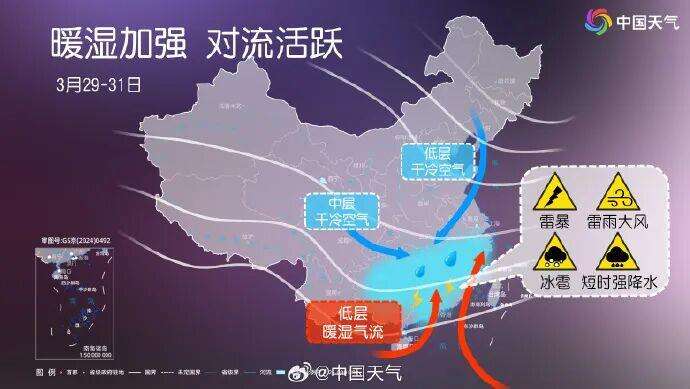 29日至31日,江南、华南中北部及贵州等地还将迎来今年首场大范围强对流天气过程。