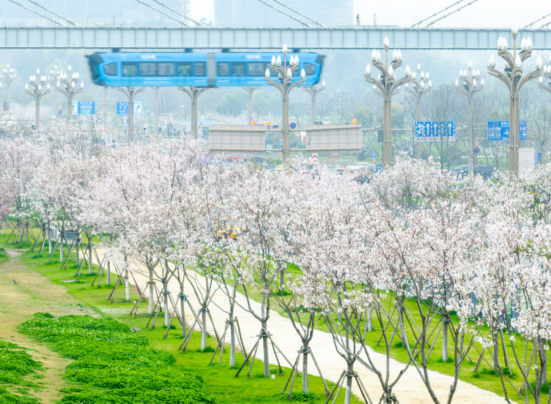 出了地铁口,不远处就是樱花市集,不仅能拍美照、买周边,还能直接坐上空轨,俯瞰沿途10.5公里的美景。来自广东的冯女士第一次坐空轨,被脚下的透明玻璃惊喜到了:“脚下有风景,窗边也有风景!太神奇了!”