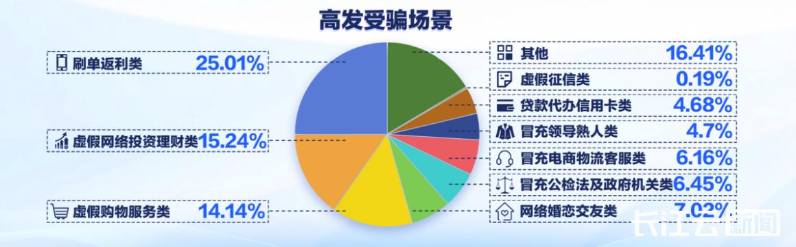 高发诈骗类型方面,2025年湖北电诈前五类型依次为:刷单返利类(25.01%)、虚假网络投资理财类(15.24%)、虚假购物服务类(14.14%)、网络婚恋交友类(7.02%)、冒充公检法及政府机关类(6.45%)。