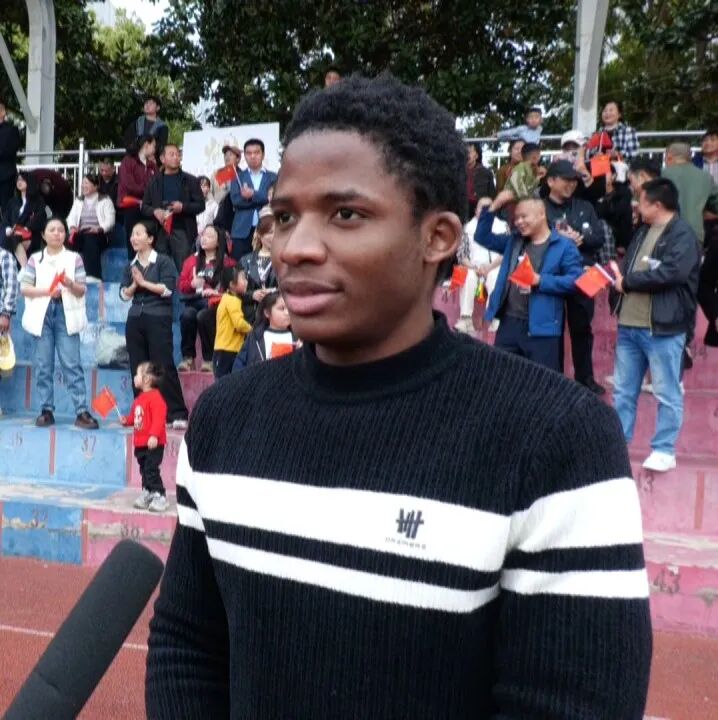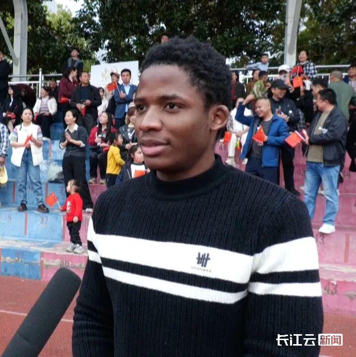 留学生 谭明(喀麦隆):大家好,我来自湖北工程学院,我在安陆,很高兴为烟店太白队加油,让我们一起为球队助威!