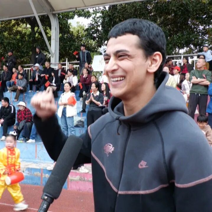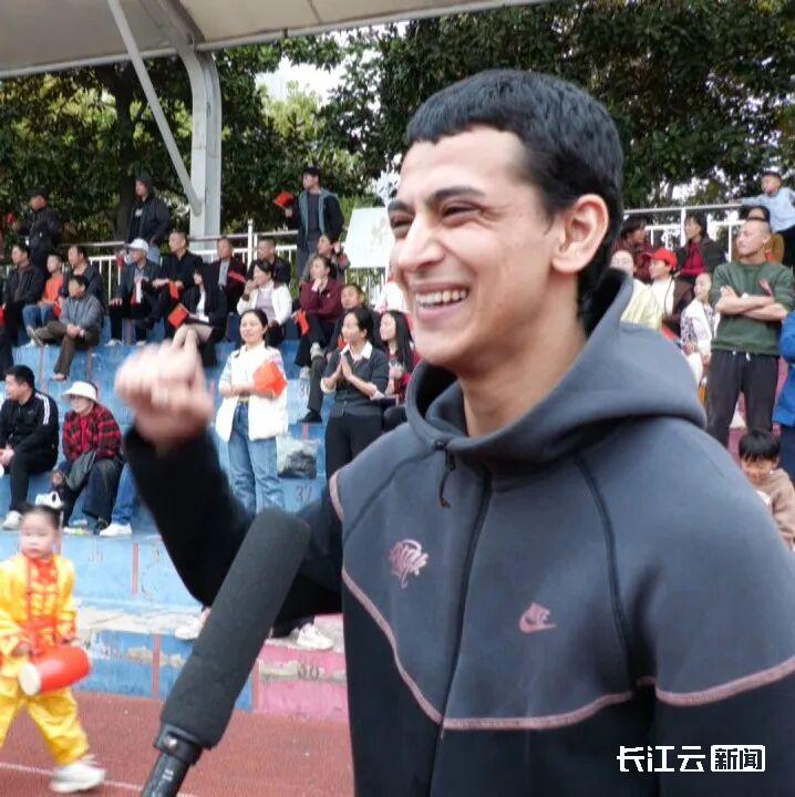 留学生 阿里(阿富汗):今天能来到现场看比赛,我特别兴奋!我来自湖北工程学院,我在这儿支持烟店太白队,加油!