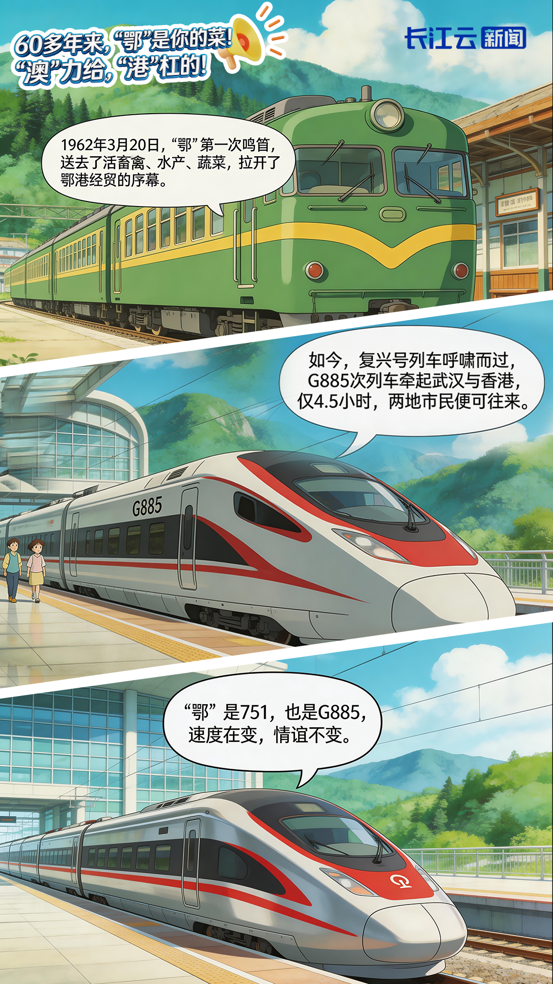 一趟装满了刚出栏活猪的货运专列,从武汉江岸货场鸣笛驶出,两天后抵达深圳北站。经层层检验,生猪存活率高达90%,随后换乘汽车进入香港。同年12月,内地又增开751次(长沙北站)、753次(上海新龙华站)及755次(郑州北站)班列,“三趟快车”从此承担着保障港澳民生、稳定港澳人心的国家使命。
