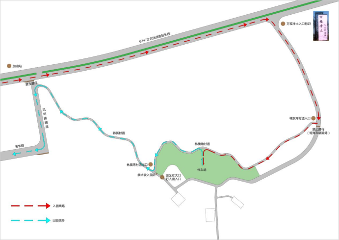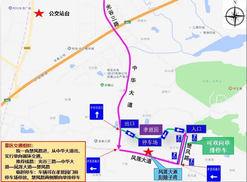 清明节期间7:00-16:00,柴泊大道-347国道-林旗湾村道-万福净土陵园停车场-韩家衖村道-武汉宝龙世家旁(风华路)辅道-玉华路实行顺时针单向通行。