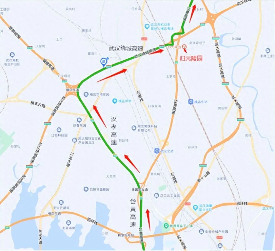 绕行线路:祭扫高峰期经由岱黄高速到前川地区的驾驶员,可选择在桃园集互通处绕行汉孝高速→横店互通→武汉绕城高速→黄陂互通→岱黄高速,以避开归元陵园通行缓慢路段。未绕行车辆可能会受到排队进入陵园车辆影响,请提前沿最左侧车道通行,谨慎驾驶、注意安全。