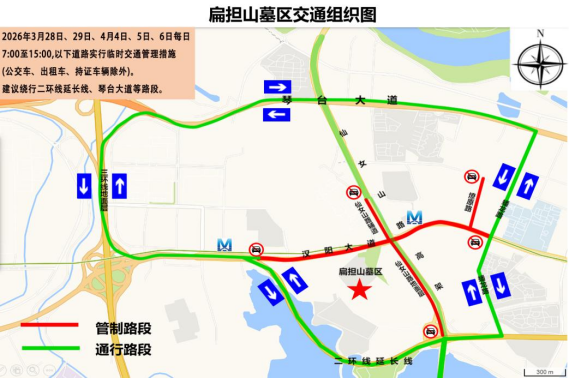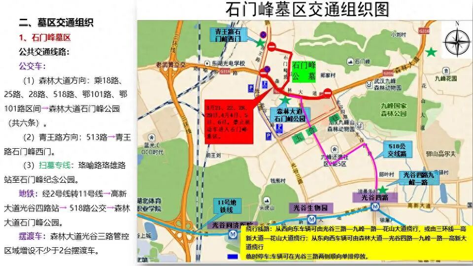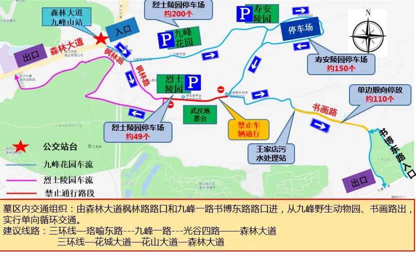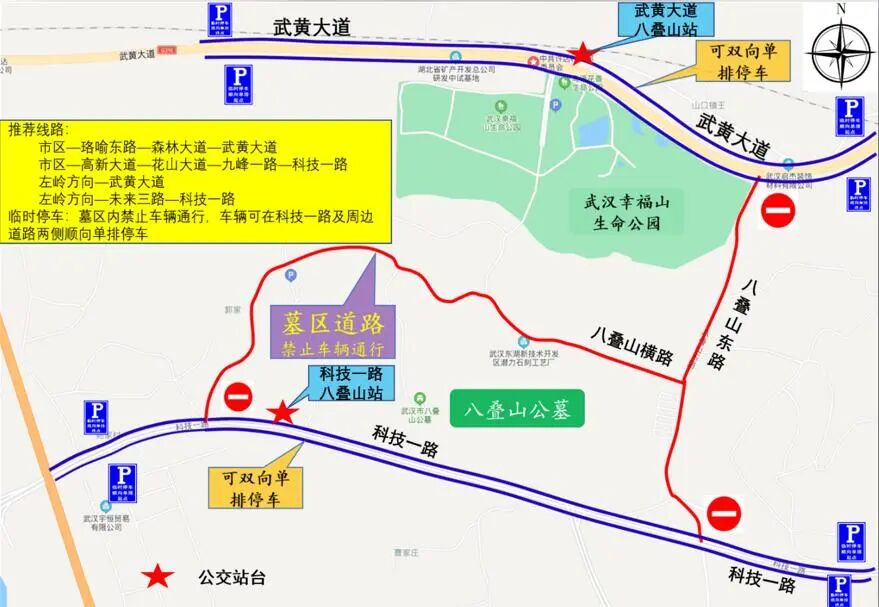 交通管控:禁止机动车进入墓区,车辆在森林大道(武黄大道)、科技一路及周边道路两侧临时单排停放。