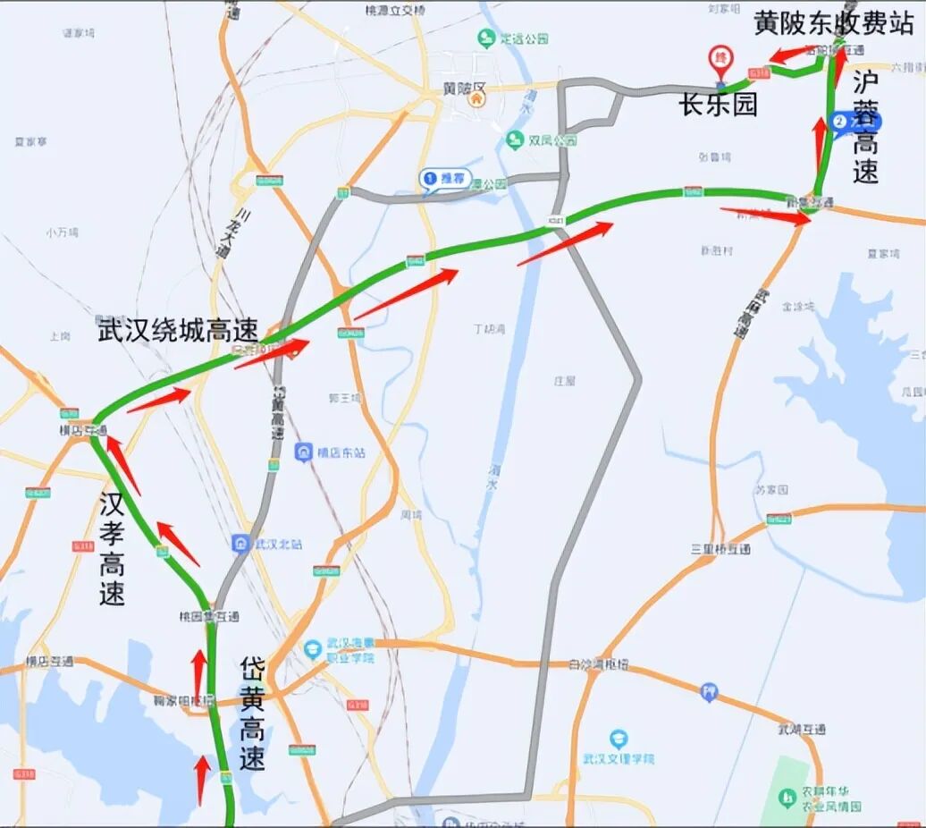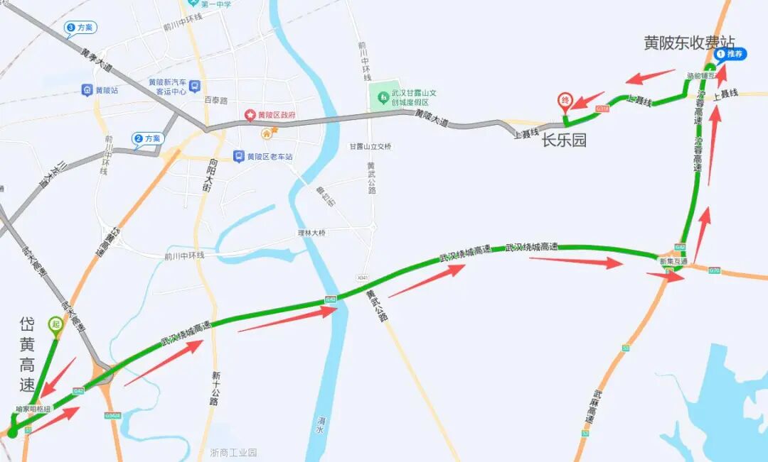 - 线路1:在桃园集互通处绕行汉孝高速→横店互通→武汉绕城高速→新集互通→沪蓉高速→骆驼铺互通→黄陂东收费站→G318→长乐园。(原路返回)