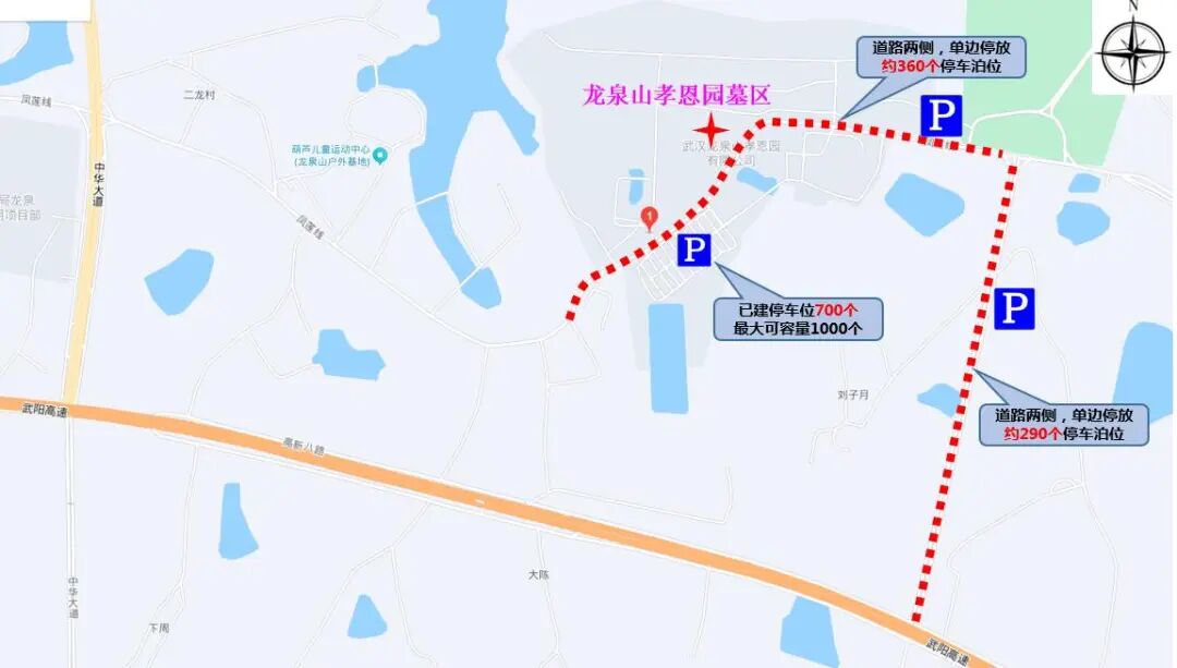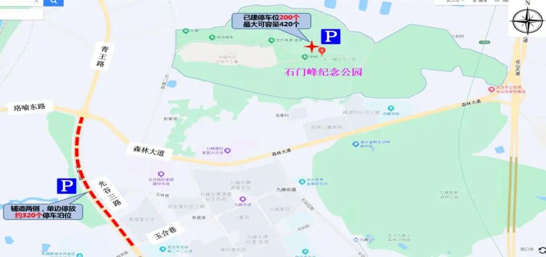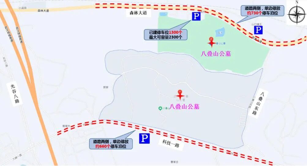 停车引导:墓区内停车位200个,最大容纳420辆。饱和后,车辆可在光谷三路(玉合巷至青王路)辅道两侧顺向单排临时停放,约提供320个泊位。