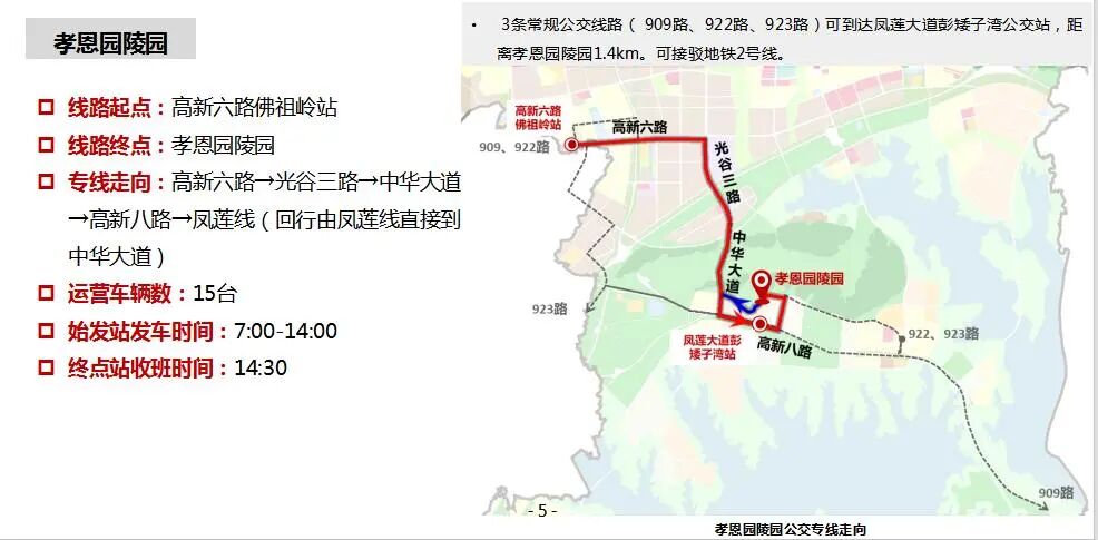 公共交通:公交车909路、922路、923路至凤莲大道彭矮子湾站。公交接驳专线为高新六路佛祖岭站至孝恩园陵园。