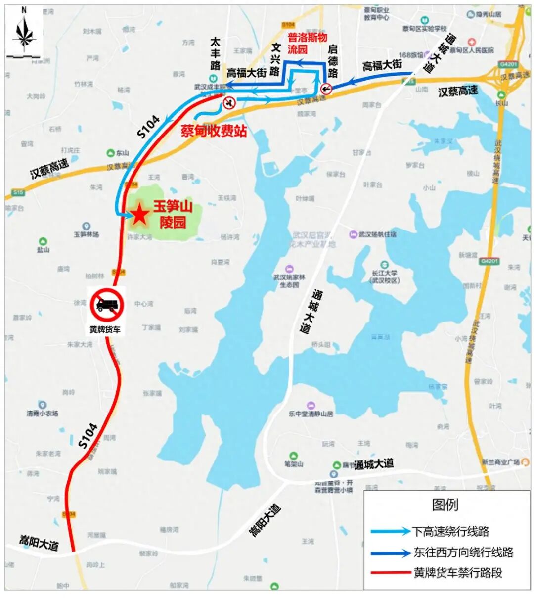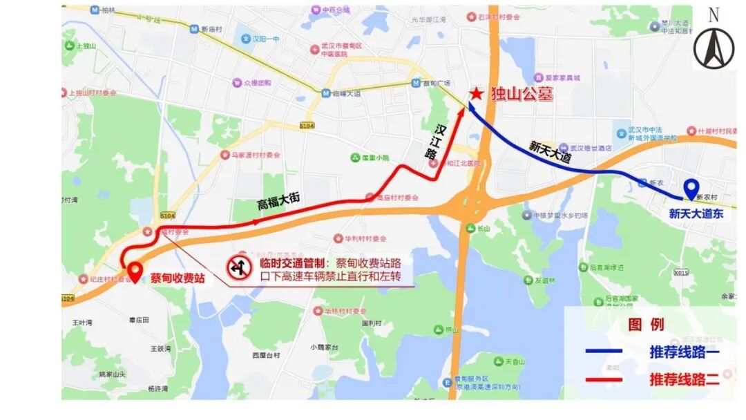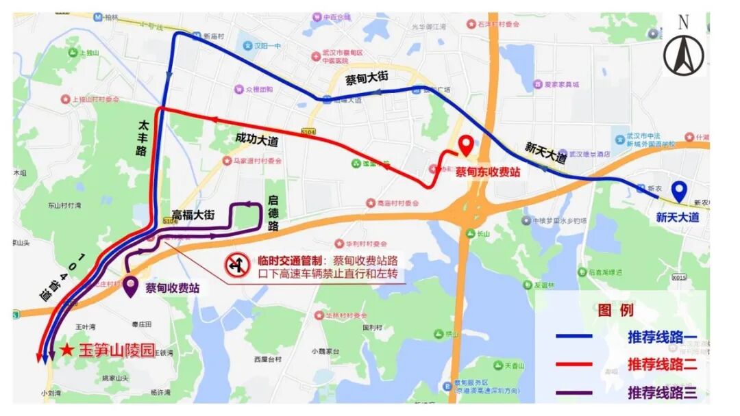- 推荐线路三:中心城区-汉蔡高速蔡甸收费站-高福大街-启德路-苏李路-高福大街-104省道-玉笋山陵园。