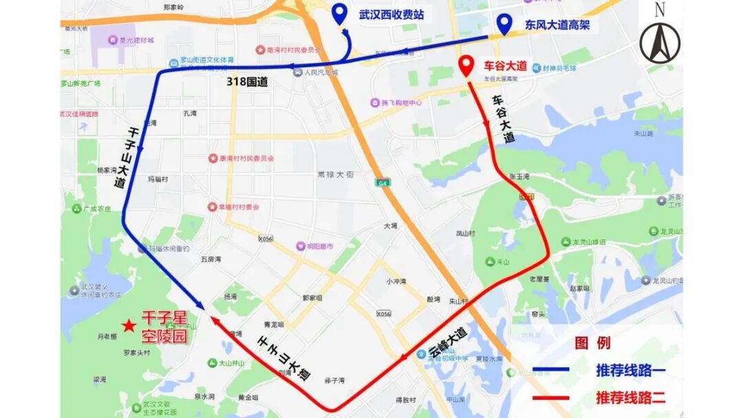 - 推荐线路一:中心城区-东风大道高架(或武汉西收费站)-318国道-千子山大道-千子星空陵园。