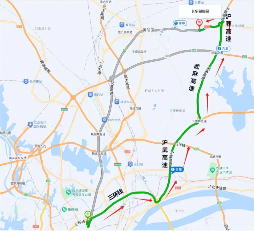 - 线路2:三环线→沪武高速→武麻高速→沪蓉高速→黄陂东收费站→G318→长乐园。(原路返回)
