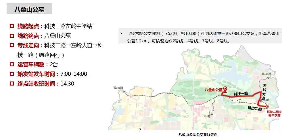 公共交通:公交车25路至武黄大道八叠山站;鄂101路、鄂101区间、753路至科技一路八叠山站。公交接驳专线为科技二路左岭中学站至八叠山公墓。地铁可乘2号线→珞雄路站→换乘25路至武黄大道八叠山站;11号线→光谷七路高新大道站→换乘753路至科技一路八叠山站。有轨电车L2线路→华为武汉基地站→换乘753路至科技一路八叠山站。