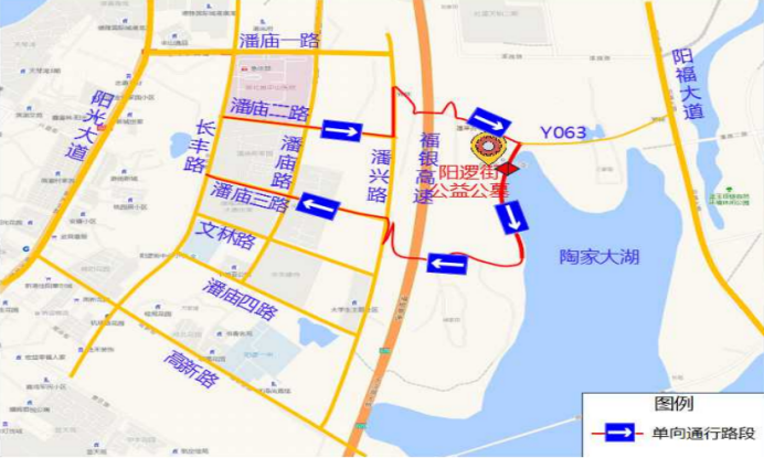 清明节期间7:00-16:00,潘庙二路-潘兴路-063乡道-沿湖无名道路-潘庙三路实行顺时针单向通行。