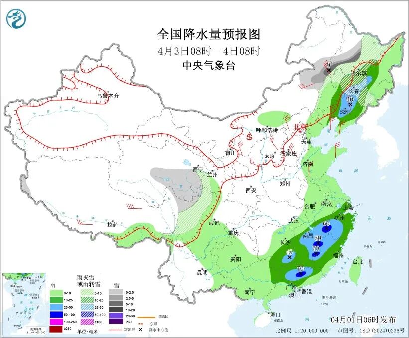 后天,内蒙古东北部、黑龙江中西部、吉林中西部、青海东部和南部、川西高原北部等地部分地区有小到中雪或雨夹雪,其中,内蒙古东北部、黑龙江西南部等地部分地区有大雪。辽宁大部、江南大部、华南北部和东部等地部分地区有中到大雨,其中,江西东部、浙江西南部、福建西部、广东北部等地部分地区有暴雨。