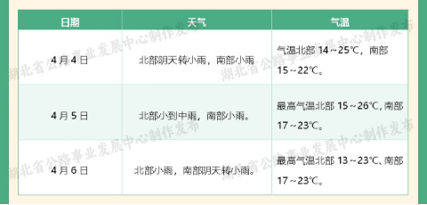 预计2026年“清明”假期期间(4月4日—6日),湖北雨日较多,气温先升后降,7日前后受弱冷空气影响,气温下降,但气温总体适宜。具体预报如下: