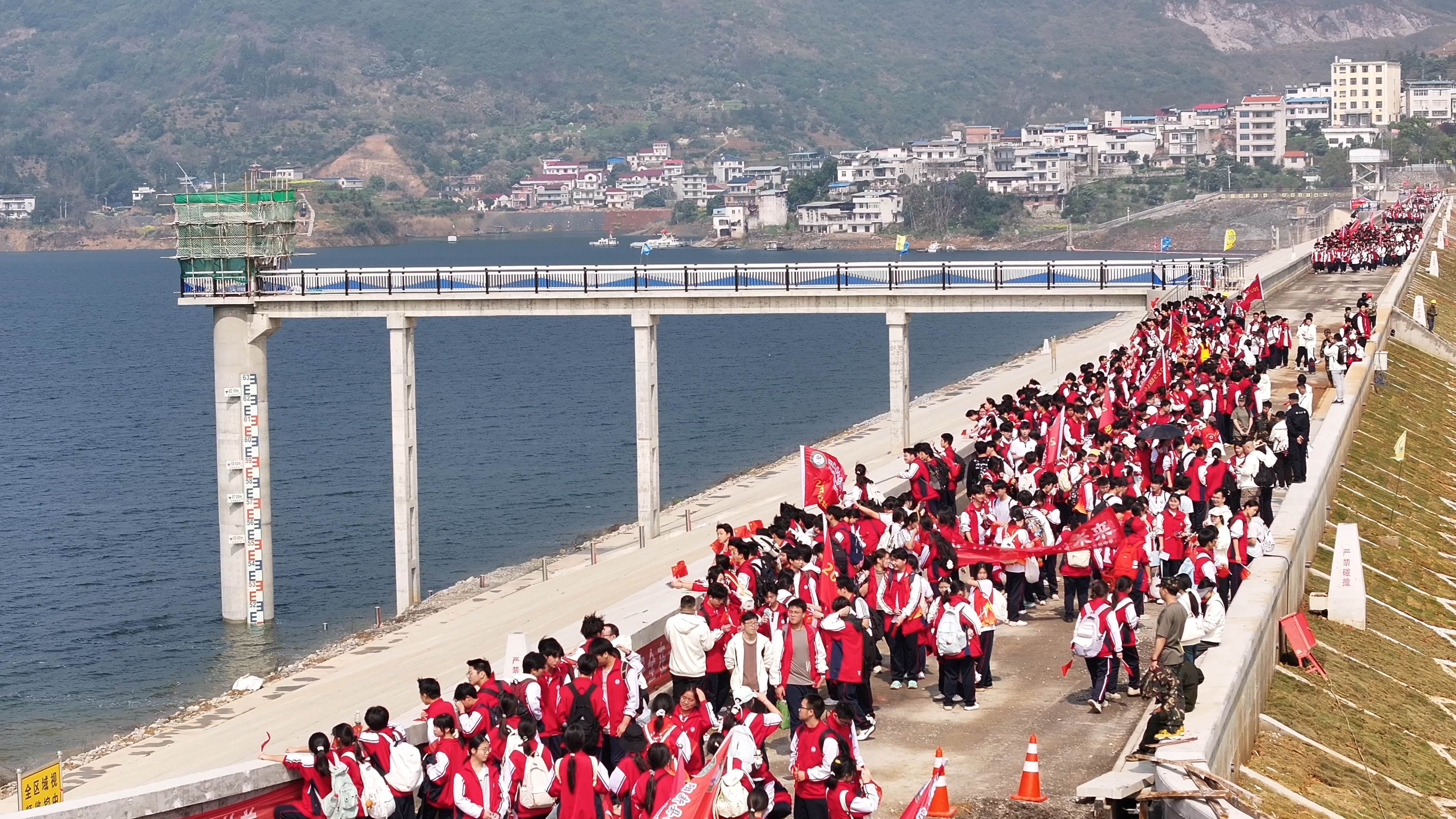 徒步途中,红色教育与实践体验一路相伴。行至富水水库大坝,建设者深情讲述当年攻坚克难、艰苦奋斗的感人历程,师生们驻足聆听、深受触动,齐声唱响红色经典歌曲,嘹亮歌声回荡在青山碧水之间;途经汪家垅村、渡口村,队伍与老区群众热情互动,村民们驻足挥手、温情致意,尽显鱼水情深;走进龙港革命历史纪念馆与红军街,大家在一件件珍贵文物前驻足凝视,在一条条青石板路上追寻红色印记,认真聆听革命故事,沉浸式感悟革命先辈的坚定信仰与无畏气概。