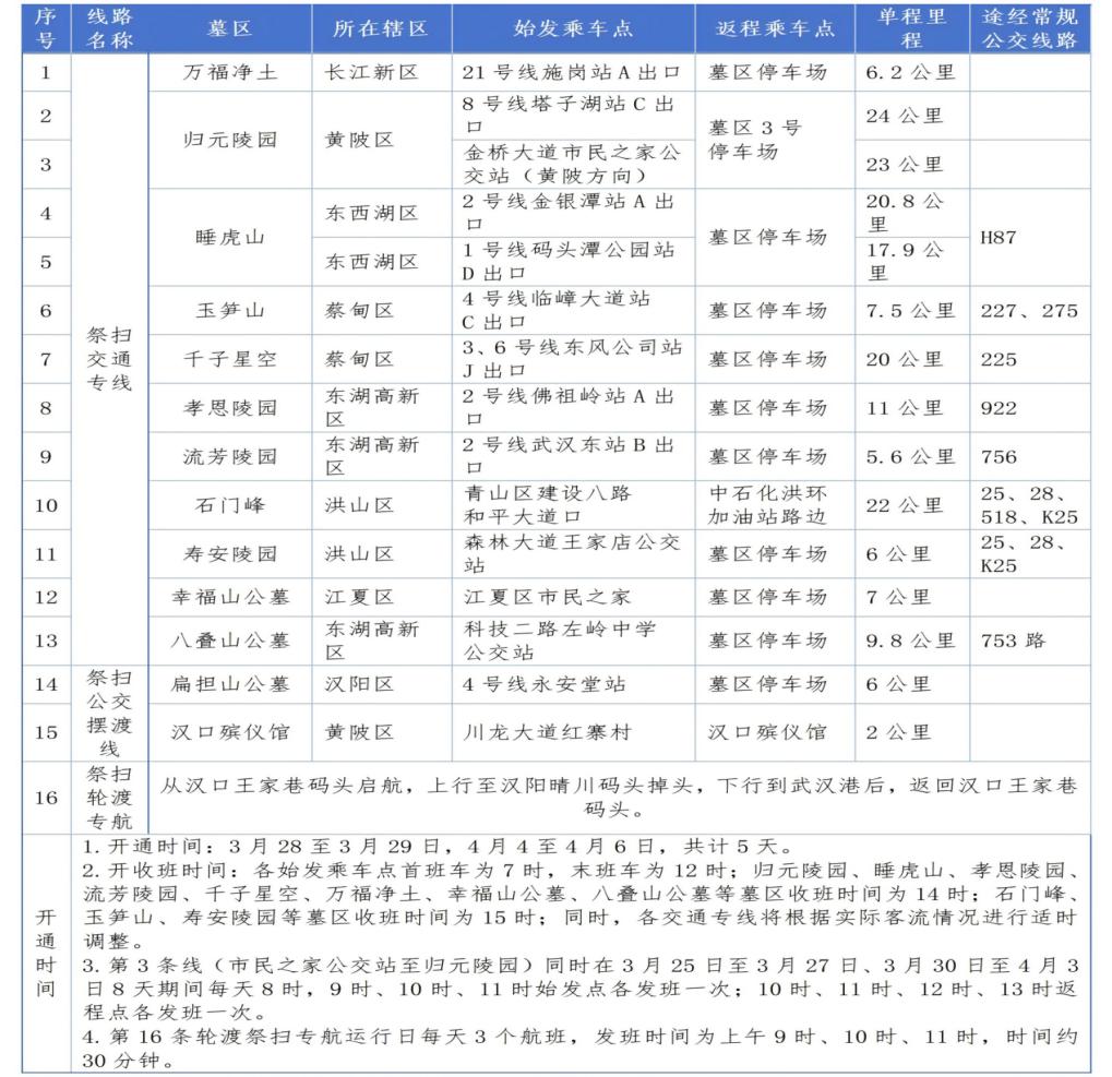 清明假期13条公交祭扫专线、2条祭扫摆渡线、1条祭扫轮渡专航持续服务祭扫市民,覆盖石门峰、寿安陵园、归元陵园、睡虎山、玉笋山等全市主要墓区,始发点首班7时、末班12时,墓区返程末班14—15时,根据客流动态加密班次。