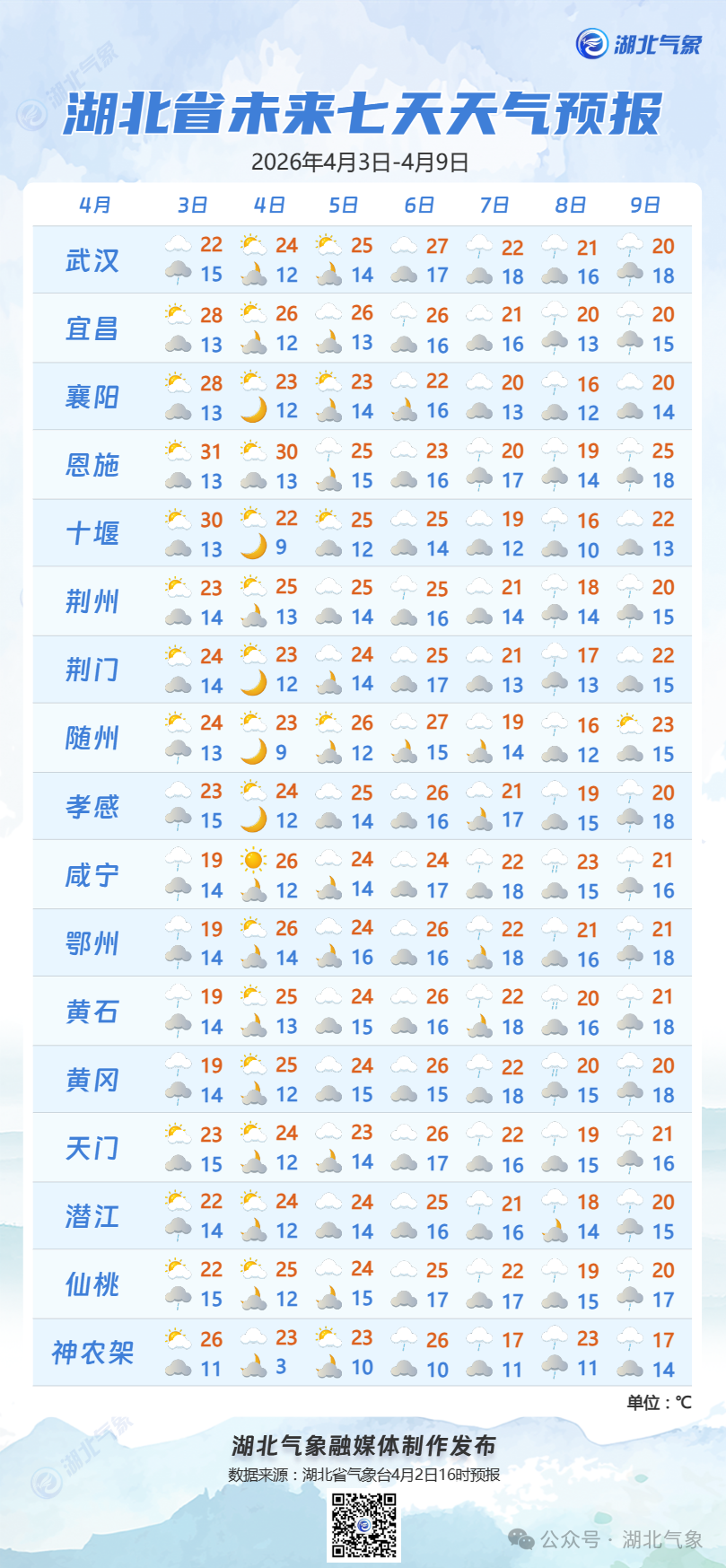4月3日08时-4月4日08时,江汉平原南部、鄂东北东部、鄂东南小雨转多云;其他地区多云到晴天。最高气温西部25~29℃、中东部18~24℃,最低气温鄂西北7~11℃、其他地区11~14℃,偏北风3到4级、阵风5到7级、夜间转2到3级。