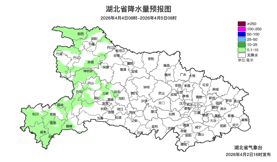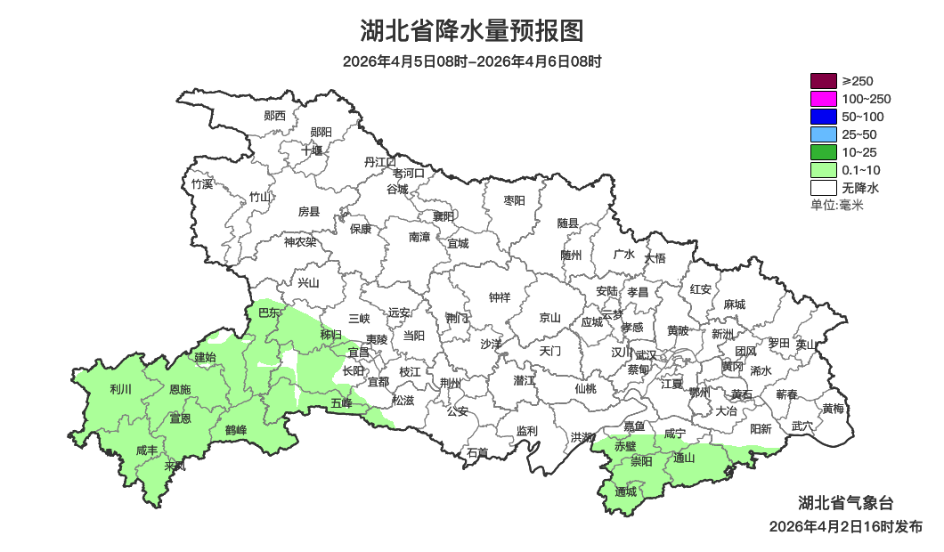4月4日08时-4月5日08时,鄂西北西部、鄂西南多云有分散性阵雨;其他地区晴天到多云。最高气温22~28℃,最低气温北部10~13℃、南部13~16℃,偏北风转偏南风2到3级。