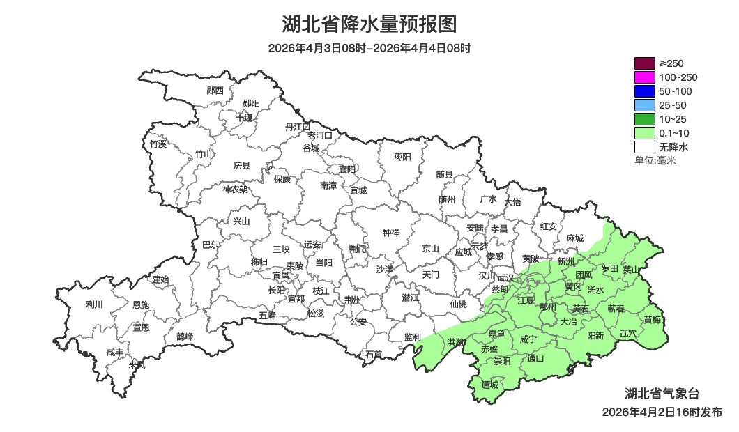 昨天(4月2日),湖北省大部地区有小雨出没,南部部分地区出现中雨、咸宁2乡镇大雨。受降雨影响,大部地区最高气温降至16~22℃,鄂西部分地区降温幅度超10℃。今晨16个乡镇出现浓雾,最低气温11~15℃。