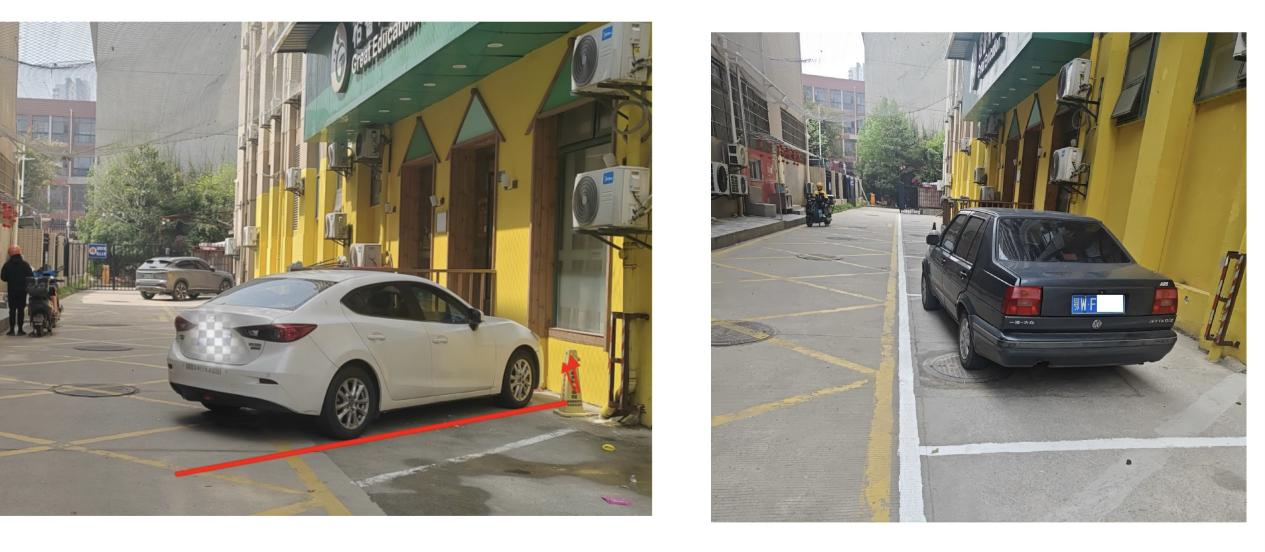 (左图为整改前停车斜线长度不足;右图为整改后不再占用消防车道)