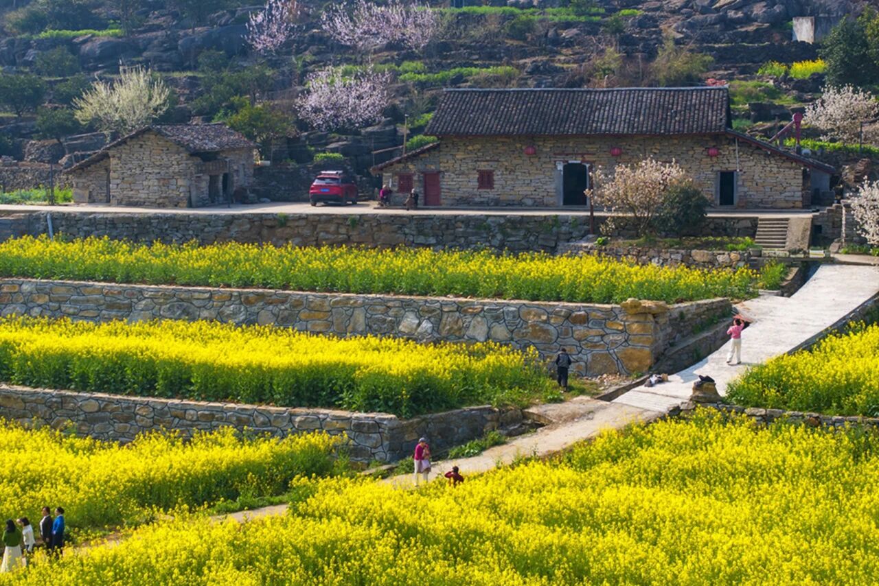 宜昌夷陵南岔湾石屋群:田埂间、坡地上、村落旁,一片片金黄肆意蔓延。金黄花海与斑驳石墙、潺潺河水交相辉映,构成独特的自然生态画卷。