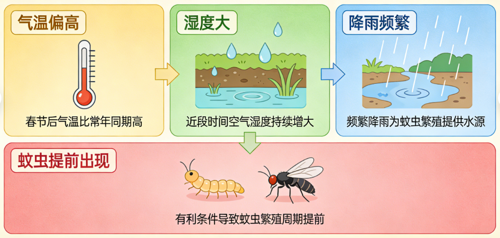 华中农业大学动物科学技术学院粟绍文教授分析指出:“今年春节以来天气就比较暖和,气温比常年同期偏高,再加上近段时间空气湿度大、降雨频繁,为蚊虫繁殖创造了有利条件,导致蚊虫提前出现。”这意味着,今年的“人蚊大战”比往年来得更早。