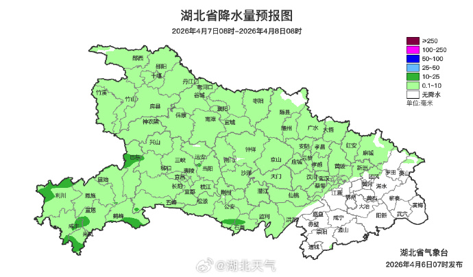 4月7日08时-8日08时,鄂西北南部、鄂西南、江汉平原西部阴天有小雨,局地中雨;鄂东南多云到阴天;其他地区多云转小雨。南部局地伴有雷电。最高气温20~25℃,最低气温13~17℃,偏北风转偏东风3级、阵风4到6级。