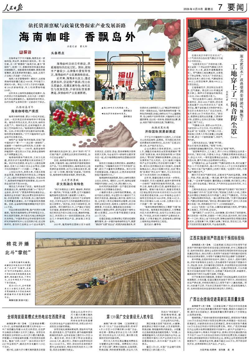 4月8日,《人民日报》刊文《工地穿上了“隔音防尘罩”》,聚焦湖北武汉水厂改造,这是湖北省第一个用全封闭气膜施工的市政项目。具体内容如下: