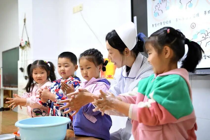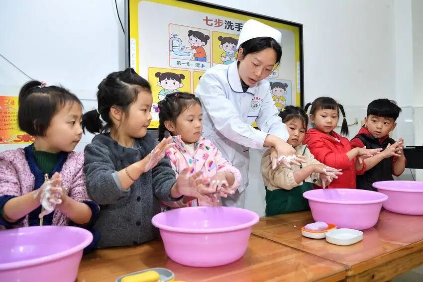 “第一步,手心对手心,这样搓……”课堂上,医护人员手把手教孩子们学习“七步洗手法”,并分组指导幼儿动手实践,及时纠正不正确的洗手习惯。揉搓、冲洗、擦干,每个步骤都配上了简单易记的口诀,让孩子们听得懂、记得住、学得会、用得上。